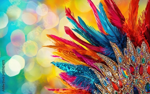 A vibrant feathered carnival headdress in bold colors, decorated with sequins and gemstones, on a bright tropical background