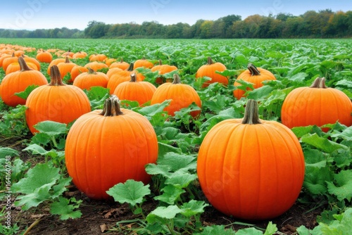 A vibrant field filled with ripe orange pumpkins surrounded by lush green leaves under a clear blue sky.