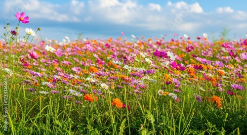 A vibrant field of colorful wildflowers under a blue sky with fluffy clouds, showcasing the beauty and diversity of nature.