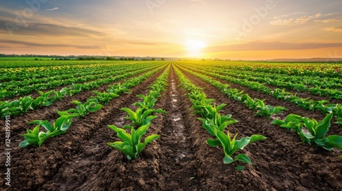 A vibrant field of lush green crops stretches toward the horizon under a golden sunrise, showcasing the beauty of agriculture and nature's bounty.