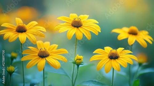A vibrant field of yellow flowers surrounded by lush green leaves, showcasing the beauty of nature's colors and seasonal blooms.