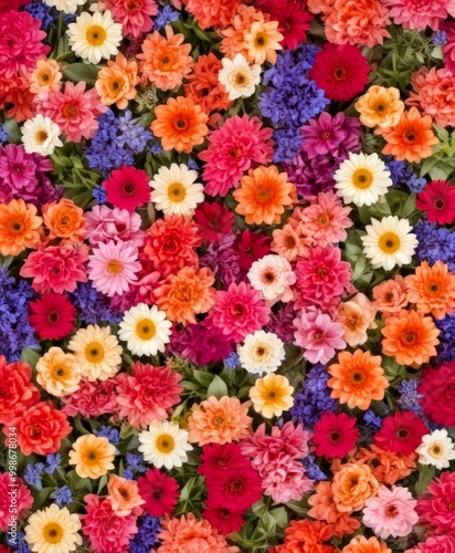 A vibrant floral arrangement composed of various types of flowers in shades of pink, orange, white, and purple, with some green foliage