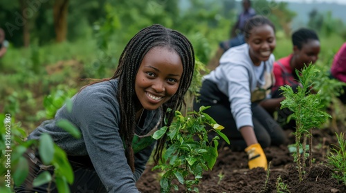 A vibrant forest conservation workshop, participants planting trees, teamwork, and serene environmental restoration.
