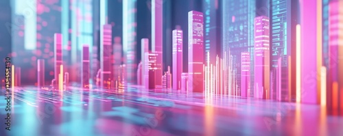 A vibrant, futuristic cityscape with glowing skyscrapers in pink and blue hues, reflecting modernity and technological advancement.