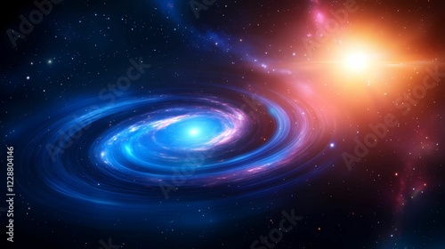 A vibrant galaxy spirals through a starry backdrop, illuminated by a bright sun, showcasing the beauty of the cosmos.