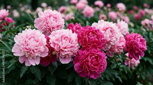 A vibrant garden filled with lush pink peonies in full bloom surrounded by green leaves