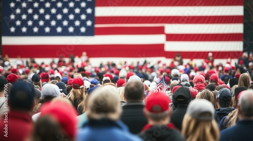 crowd, rally, political, event, american, flag, gathering, speaker, activism, oneness, sunlight, listening, democracy, patriotism, morning, community, engagement, enthusiasm, togetherness, flag, red, hat, people, audience, celebration, expression, passion, local, movement, participation, freedom, demonstration, solidarity, national, tradition, large, group, generative, ai