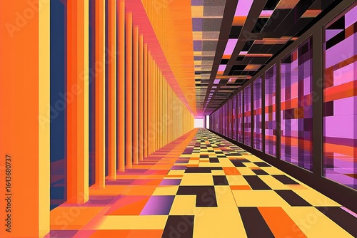 hallway, corridor, perspective, geometric, abstract, vibrant, colourful, orange, purple, pink, yellow, black, chequered, floor, wall, glasses, panel, line, shape, architecture, design, modern, contemporary, interior, space, light, bright, vanishing, point, pattern, texture, contrast, bold, high-coloured, saturated, sharp, digital, artwork, illustration, graphic, style, pixel, structure, depth, illusion, tunnel, passage, way, rectangular