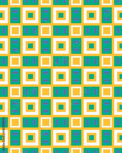 A vibrant geometric pattern showcases squares and rectangles in bright colors, ideal for use in fabric designs or interior decor