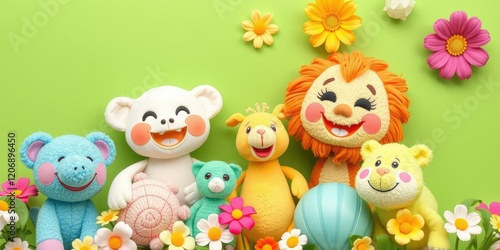 A vibrant green background with adorable, cute objects like plush toys, flowers, and smiling animals, smiling, vibrant