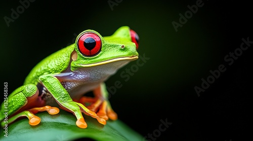 A vibrant green frog with bright red eyes sits peacefully