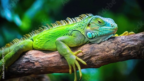 lizzard, reptile, green, tree branch, tree, nature, animal, scale, skin, head, eye, body, claw, foot, detail, close, up, vibrant, wildlife, environment, fauna, wild, exotic, texture, pattern, colours, water, turquoise, emerald, spine, ridge, crest, leg, resting, calm, peaceful, tranquil, sunlight, macro, closeup, tropical, scaled, basking, high-coloured
