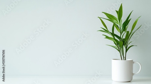 A vibrant green plant sits in a simple white mug. The plants leaves are long and slender. The image is cleanly composed against a light teal background. The photos quality is high, showing crisp de