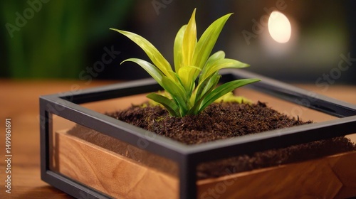 A vibrant green plant thriving in a stylish glass terrarium on a wooden table, with a warm background glow