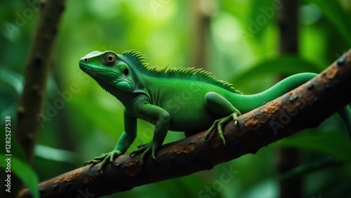 A vibrant green sailfin lizard perched on a branch in a lush, tropical environment.