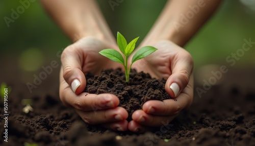 A vibrant green seedling is cradled by gentle hands filled with rich, dark soil, symbolizing growth.