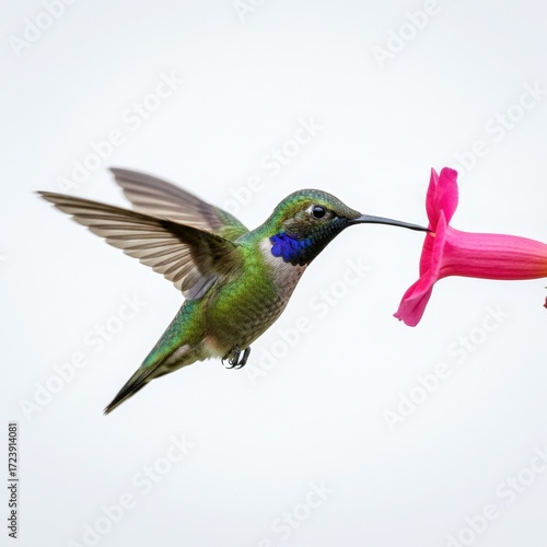 A vibrant Green-crowned Brilliant hummingbird sips nectar from a bright pink flower in mid-flight, showcasing its iridescent plumage and the delicate beauty of nature photography.