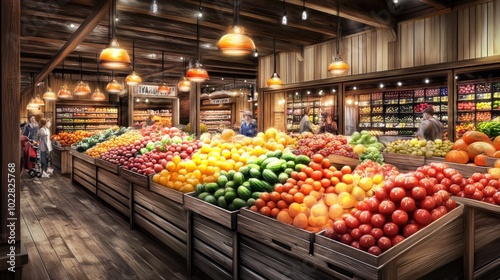 A vibrant grocery store filled with fresh fruits and vegetables in wooden displays.