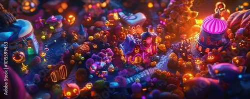 A vibrant Halloween village illuminated with colorful lights and playful pumpkins, capturing a magical celebration atmosphere.
