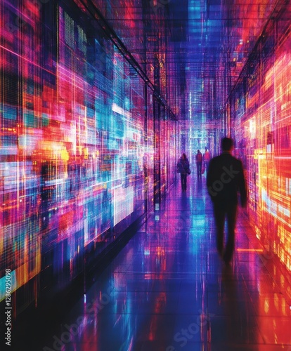 A vibrant hallway filled with bright lights, showcasing people walking through a lively and illuminated space.