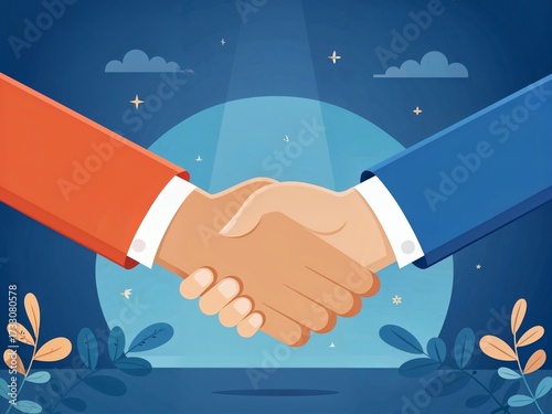 A vibrant illustration of a handshake, symbolizing agreement and cooperation between two parties in a harmonious setting.