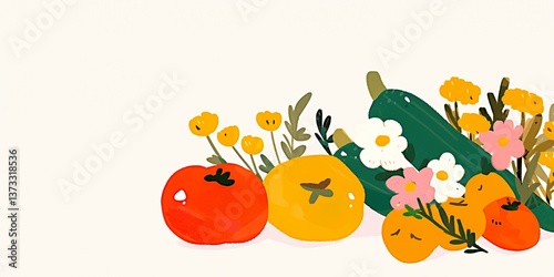 A vibrant illustration showcases a collection of fresh, organic produce, artfully arranged with delicate flowers, a beautiful display of nature's bounty.