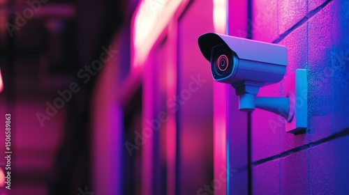 A vibrant image of a CCTV camera mounted on a storefront, monitoring the entrance and surrounding area, conveying a sense of safety for customers