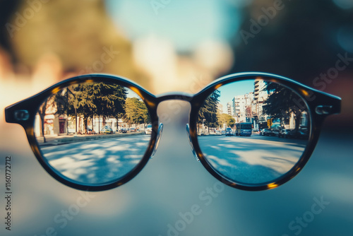 A vibrant image of round sunglasses reflecting a bustling street scene, showcasing a blend of urban life and stylish eyewear.