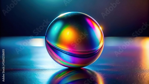 A vibrant iridescent sphere rests on a reflective surface, showcasing a spectrum of colors under dynamic lighting conditions