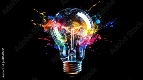 a vibrant lightbulb explosion showcasing creativity inspiration and innovation on a black background with splatters of colorful paint