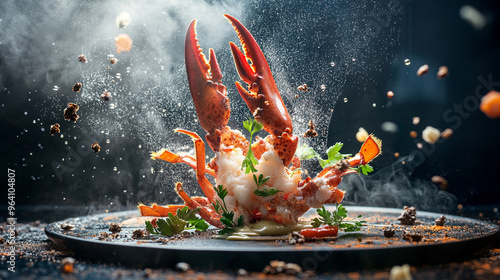 A vibrant lobster splashing onto a plate, surrounded by herbs and spices, showcasing an exquisite seafood dish.