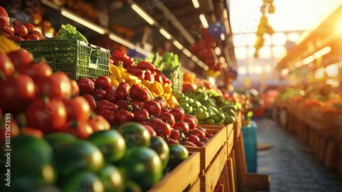 A vibrant market scene showcasing fresh fruits and vegetables, with colorful displays illuminated by warm sunlight.