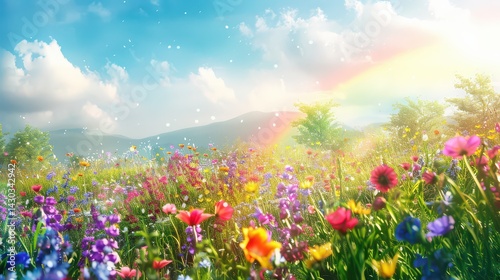 A vibrant meadow filled with colorful flowers under a bright sky with a faint rainbow arc present