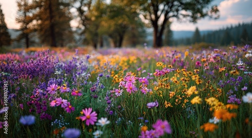 A vibrant meadow filled with wildflowers in various colors, under a soft, diffused light