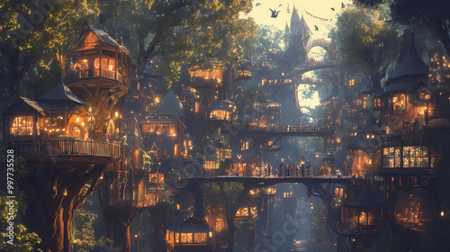 A vibrant metropolis of shimmering treehouses and bustling marketplaces filled with whimsical creatures like talking birds and tree . . Fantasy Marketplace. Illustration