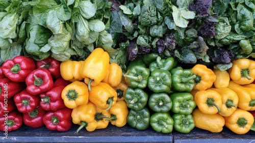 A vibrant mix of fresh produce, including bell peppers and leafy greens, arranged neatly with copy space available