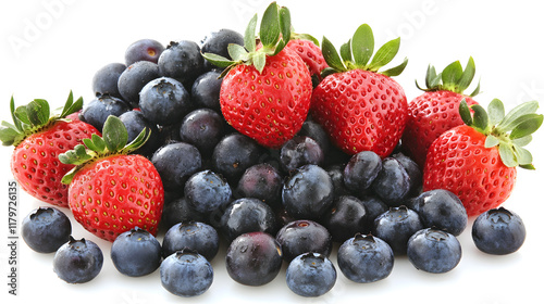 A vibrant mix of fresh strawberries and blueberries, glistening with moisture. The red and blue hues create a delicious contrast against a bright white background.