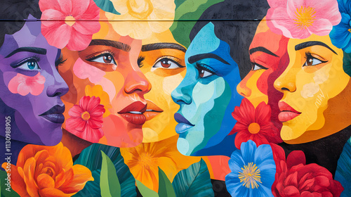 A vibrant mural depicting women's faces with a floral overlay representing unity in diversity. Mural. Illustration
