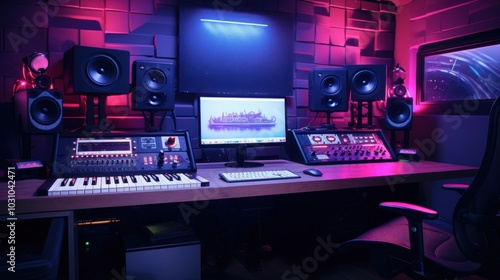 music, studio, production, equipment, vibrant, neon, light, creativity, sound, technology, electronic, innovation, workspace, exploration, audio, instrument, control, professional, digital, mixing, atmosphere, environment, gear, artistic, illuminated, speaker, monitor, contemporary, creative, setting, advanced, refining, visual, station, workshop, electronic, lifestyle, energy, imaginative, acoustic, dynamic, oneness, expression, modern
