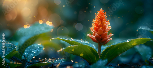A vibrant nature rainforest in spring, new leaves emerging, and wildflowers blooming, with a close-up of a single flower