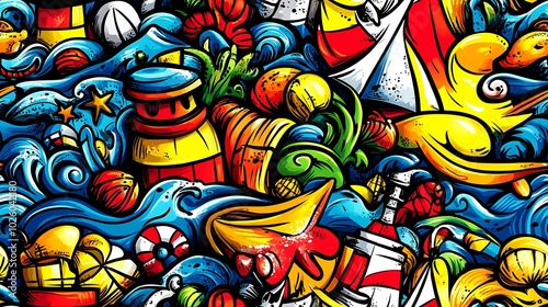 nautical, doodle, pattern, sailboat, anchor, lighthouse, wave, starfish, seashell, fish, oceanic, colours, hd, quality, stylised, cartoon, art, playful, lively, maritime, composition, vibrant, decorative, colourful, aesthetic, visual, joyful, imaginative, whimsical, unique, cheerful, creative, expression, artistic, modern, bold, bright, fun, dynamic