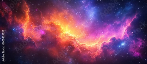 A vibrant nebula filled with swirling gas and dust, glowing in shades of pink, orange, and blue against a backdrop of twinkling stars.