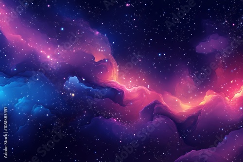 A vibrant nebula with pink, purple, and blue hues against a dark, starry background.