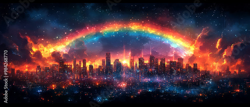 A vibrant night skyline illuminated by a dazzling rainbow, creating a stunning contrast against a fiery backdrop.