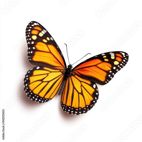 A vibrant orange and black Monarch butterfly with spread wings, showcasing intricate patterns against a plain background.