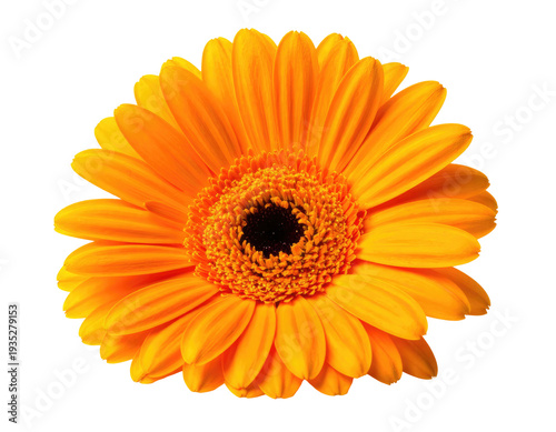 A vibrant orange gerbera daisy with a dark center on a white background