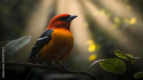 bird, orange, red, sunlight, foliage, nature, wildlife, closeup, perched, tree branch, plumage, detail, tropical, forest, eye, beak, wing, jungle, conservation, photo, fauna, vibrant, colours, beauty, exotic, small, songbird, passerine, imagery, animal, light, shadow, texture, feather, pattern, sharpened, sharp, high-coloured, symmetry, balance