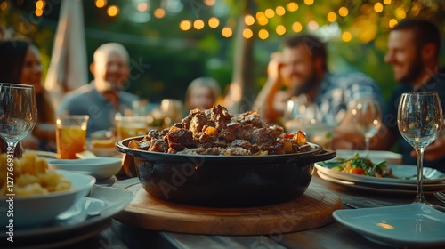 dinner, gathering, friends, food, celebration, bar-b-q, drink, laughter, outdoors, party, meat, vegetable, plate, goggles, atmosphere, joy, dining, cookery, summer, socialising, table, cooking, enjoyment, favor, warmth, community, relaxation, ambience, nature, hospitality, memory, togetherness, feasting, sharing, festive, scenery, sunlight, happiness, camaraderie, savoury, life events, epicure, variety, dish, appetising, culinary, family, fun, toast