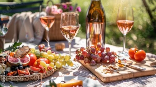 A vibrant outdoor picnic scene with a bottle and glasses of rose wine, accompanied by a selection of fruits and snacks on a sunny day