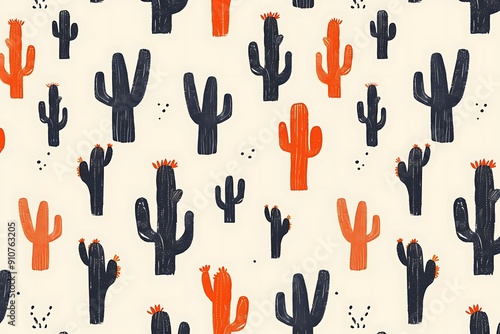 A vibrant pattern featuring various black and orange cacti against a light beige background, creating a playful and trendy design.